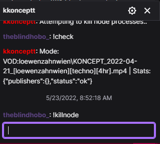 We were able to check on the streaming machine remotely via Twitch whispers. If anything started to seem strange on the stream, we could restart the node.